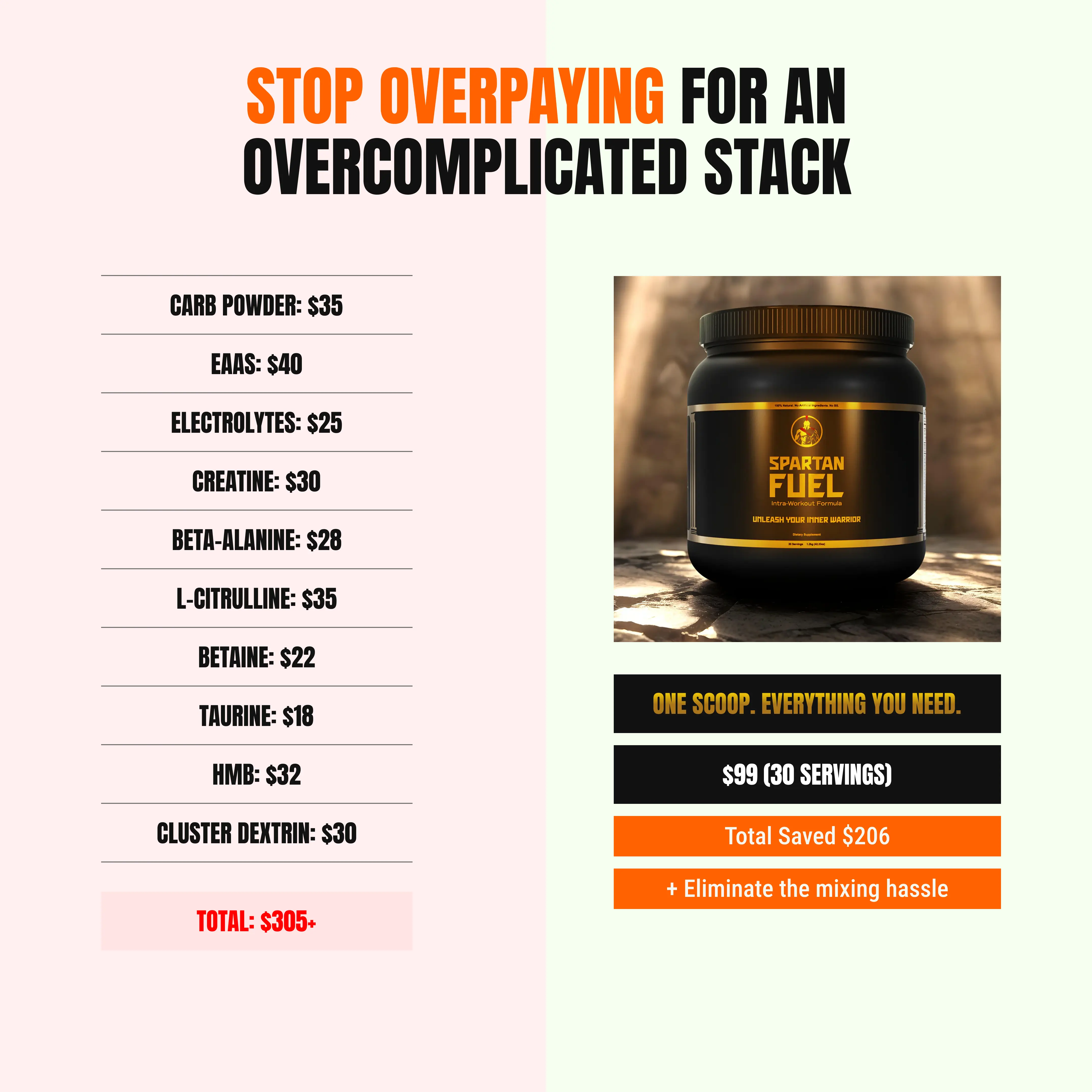 Spartan Fuel gives you everything in one clinically dosed scoop—and saves you hundreds of dollars in the process.